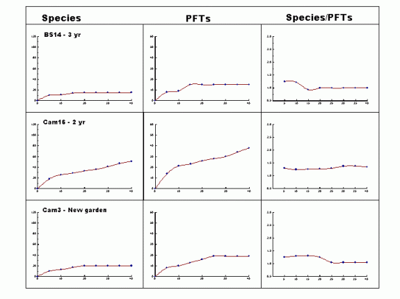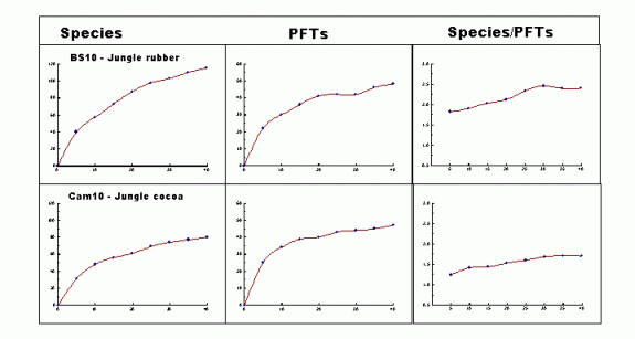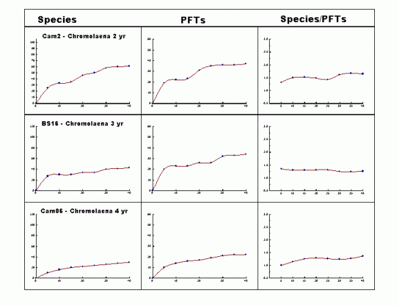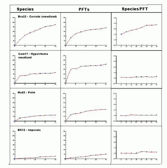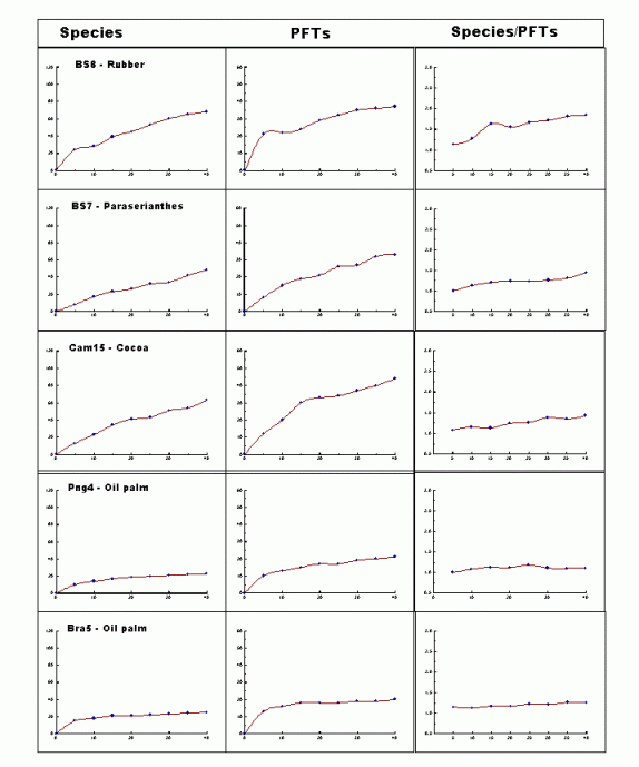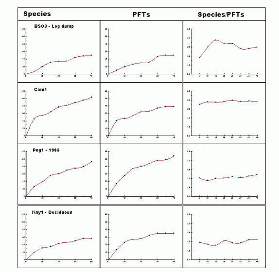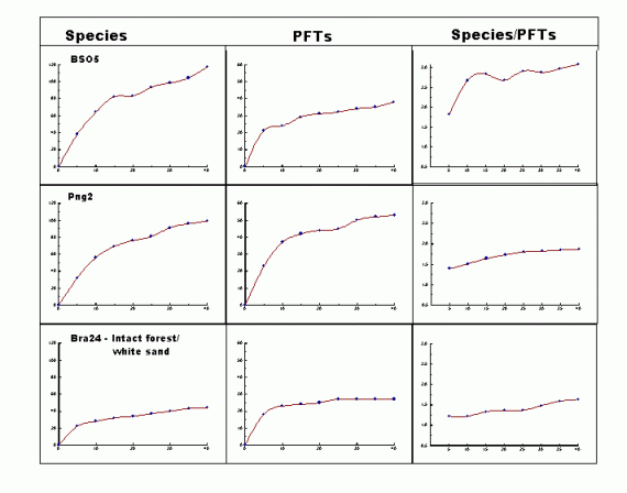 The following seven figures illustrate the cumulative area curves for the ratios of species to area, plant functional type (PFT) to area, and species/PFT to area in a variety of vegetation types at a number of different locations. Many of the sites are included in Appendix 1. In each graph, the y-axis represents frequency, and the x-axis the distance along a 40 x 5 cm quadrat. The site abbreviations are as follows: BS = Jambi, Sumatra; Bra = Brazil; Cam = Cameroon; Kny = Kenya; Mad = Madagascar; and Png = Papua New Guinea.