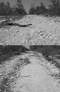 ) near Inwood, Manitoba. Note that snakes crossing the road generally do so by moving perpendicular to the main axis of the road.